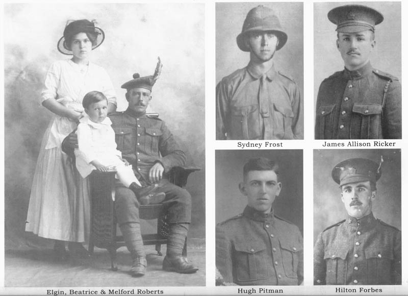 On the left is a professional family portrait taken by the Yarmouth Portrait Co. in 1916-1917 of Pte. Elgin Clifford Roberts and his wife Beatrice and son Melford. Small photos top row l to r: Captain Charles Sydney Frost. This photograph of Frost as a private was printed on postcard stock and mailed from Cairo in 1915. Frost enlisted in the Royal Newfoundland Regiment, “ The Fighting Newfoundlander” in 1914. He contracted enteric fever at Galliopli, was seriously wounded at Gueudecort, and was awarded the military cross for gallantry at Kieberg Ridge for carrying a wounded comrade across No Mans’ Land back to Allied lines. Pte. James Allison Ricker enlisted in the 112th Overseas battalion in 1915. He was sent to France with the Royal Canadian Regiment. On August 26, 1918 he was wounded, for the second time, taken prisoner and died the next day. He is buried in the British cemetery of Cabaret-Rougein Souchez, France. Bottom Row l to r: Hugh Campbell pitman. He was a lumberman before enlisting in the CEF an on return worked in the gold mines in Guysborough county and with construction and paving crews in Yarmouth and Shelburne counties. Amos Hilton Forbes enlisted in the 1st CMR in North Battleford Sk in 1915 where he was farming. He was transferred to the 8th Infantry Brigade, wounded (shell shocked probably) in Aachen in 1916, and captured by the Germans. Ultimately he returned to farm in Saskchewan and there married and had four children.