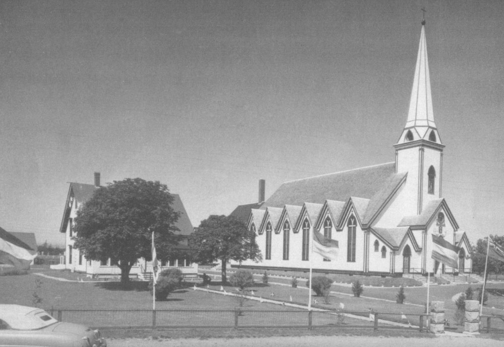 The church is architecturally unique in this part of Nova Scotia with its six bays of gothic dormers projecting from each side of the roof. The church and the parish continue to prosper today. This photograph was taken by an unknown professional photographer in 1951 during West Pubnicos Tercentenary. It was originally reproduced as a commercial postcard. Architectural plans for the building were contracted from J.B. Kinney of the firm Kinney & Haley of Yarmouth. It was constructed between 1888-1891. In 1891 the new Saint Pierre Church was completed and opened for worship.