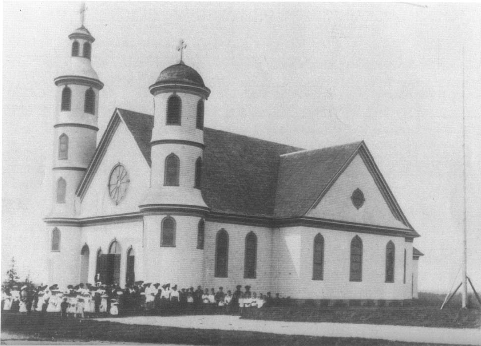 This handsome Catholic church is architecturally unique within the municipality of Argyle.No other church building in this part of Yarmouth County has rounded towers. On September 13, 1903 the blessing of the bell in the new church took place before a large gathering of parishoners and visitors. This church, now clad vinyl siding, continues to be an active and vibrant church in 2006. This photograph was taken by Amirault Hill inventor and photographer, Eugene Meuse.